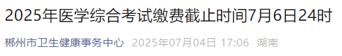即将截止!湖南郴州2025年医师资格综合笔试缴费7月8日结束!请还没有完成综合笔试缴费的考生速度按照以下官方说明尽快缴费!否则会影响2025年医师资格综合笔试考试!