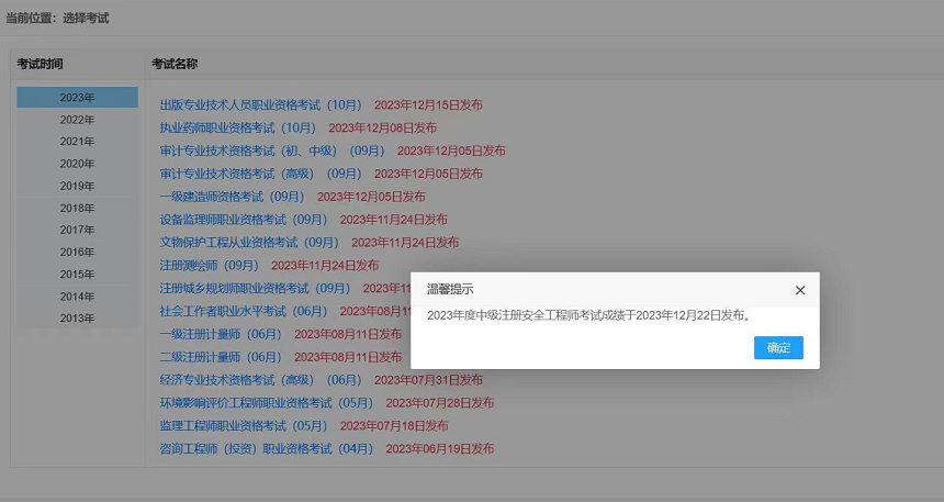 2023年度中级注册安全工程师考试成绩将于12月22日发布,成绩查询入口为中国人事考试网(http://www.cpta.com.cn/index.html)。