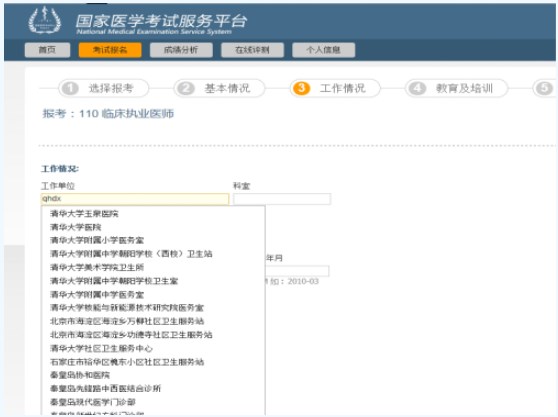 答:在系统中以上两者的填写方式相同。如填写工作单位,在网上报名系统中“工作单位”可以通过输入拼音首字母或直接填写工作单位名称的方式检索,在查询到的下拉框中选择您的工作单位即可。当鼠标从工作单位项移开后,如果工作单位文本框显示黄色表示您输入的工作单位没有收录在网站工作单位字典中(若出现此种情况,请您仔细核对输入的工作单位是否有误,若确认无误,则需申请添加数据,请按系统提示登陆相关链接进行相应的操作。考生可待后台数据库添加成功后在菜单中选择。);显示红色表示您未输入工作单位;显示灰色表示您选择的工作单位存在系统中并可以使用。如下图: