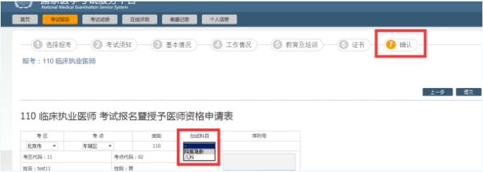 答:报考临床执业医师且在院前急救或儿科岗位的考生可以申请参加短线医学专业加试,网上填报时,在报名的第七步确认时,在表中选院前急救或儿科加试。参加短线医学专业加试的考生,如通过加试获得医师资格,限定在加试的专业或岗位范围内执业,如需变更执业范围需重新参加医师资格考试获取医师资格。如下图: