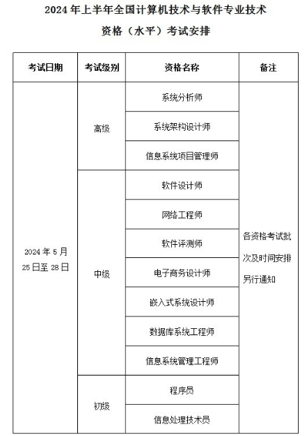 一、《2024年上半年全国计算机技术与软件专业技术资格(水平)考试安排》