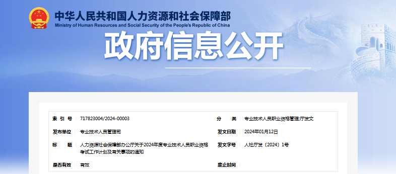 人力资源社会保障部办公厅关于2024年度专业技术人员职业资格考试工作计划及有关事项的通知