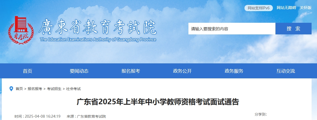 根据教育部统一安排,2025年上半年全国中小学教师资格考试面试将于2025年5月17日至18日进行。现将广东省2025年上半年中小学教师资格考试面试有关事项通告如下: