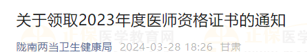关于甘肃陇南两当县领取2023年度医师资格证书的通知!小编整理如下,请相关考生及时查看,按时领取医师资格证书并及时完成注册!