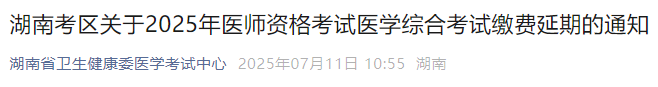 再次延期!湖南省2025年医师资格综合笔试缴费延长至7月12日截止!请还没有完成笔试缴费的考生尽快完成,避免耽误2025年医师资格综合笔试考试!