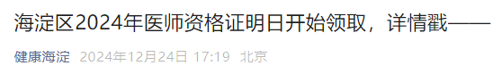 关于海淀区领取2024年《医师资格证》和《授予医师资格审核表》工作具体事项通知如下: