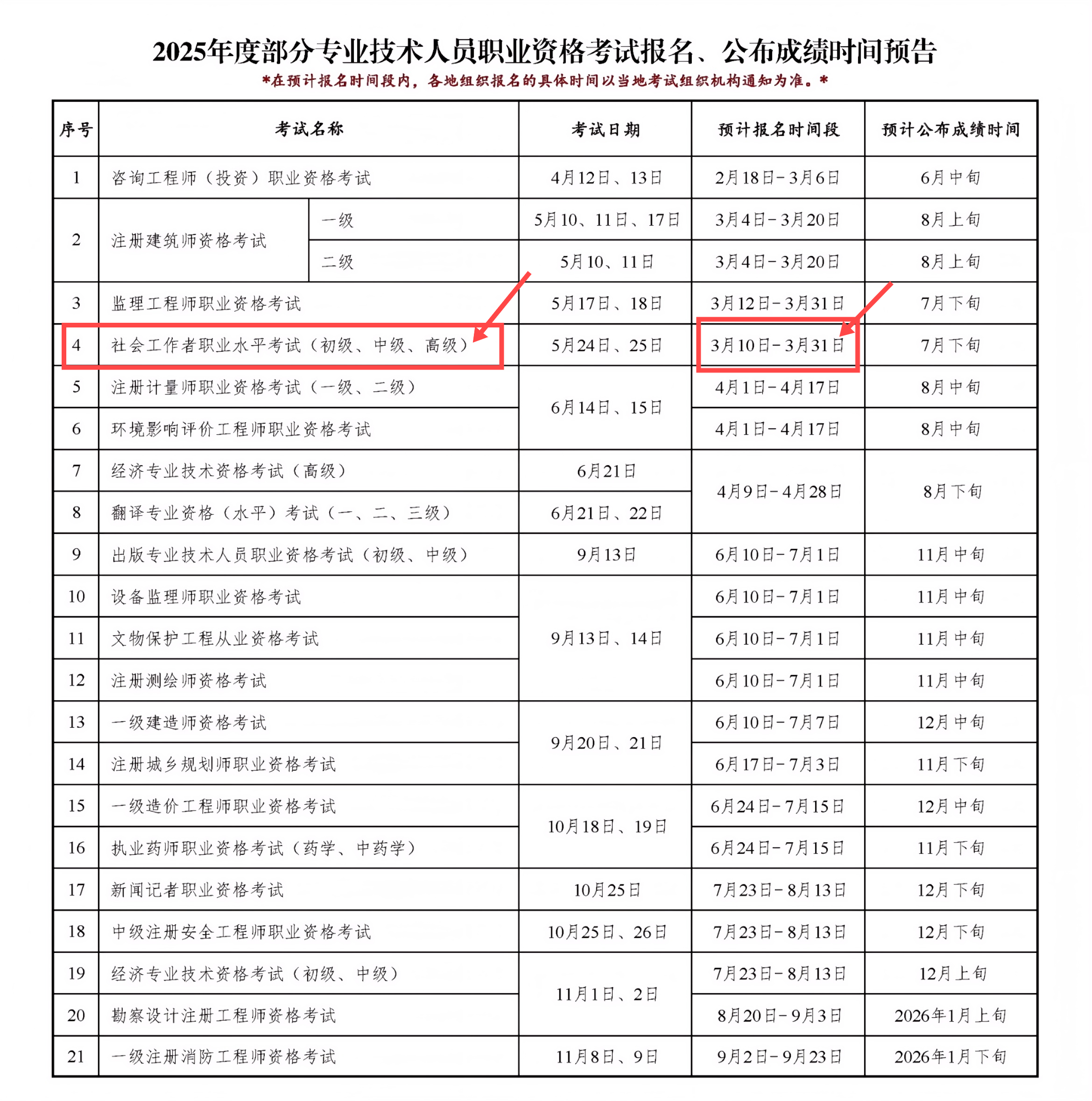 2月17日,中国人事考试网发布了《2025年度专业技术人员职业资格考试重要事项提示》,其中明确了2025年社会工作者报名时间预计为3月10日-3月31日。