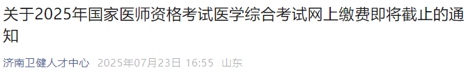官方提醒!山东济南2025年医师资格综合笔试缴费24号最后一天!请还没有完成笔试缴费的考生抓紧时间,否则将不能参加2025年医师资格医学综合考试!