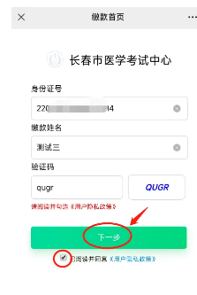 2、输入身份证号、姓名、验证码,勾选下方《用户隐私政策》,点击“下一步”。如下图。(他人代缴,请输入参加考试的考生本人信息)