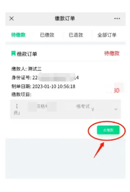 3、核对缴费信息,项目金额,核对无误,点击“去缴款”。如下图。(金额:执业220元、助理125元)
