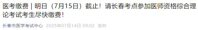 官方提醒:吉林长春2025年医师资格综合笔试缴费7月15日截止!逾期没有缴费的考生将不能参加2025年医师资格综合笔试考试,请还未完成缴费的考生抓紧时间!