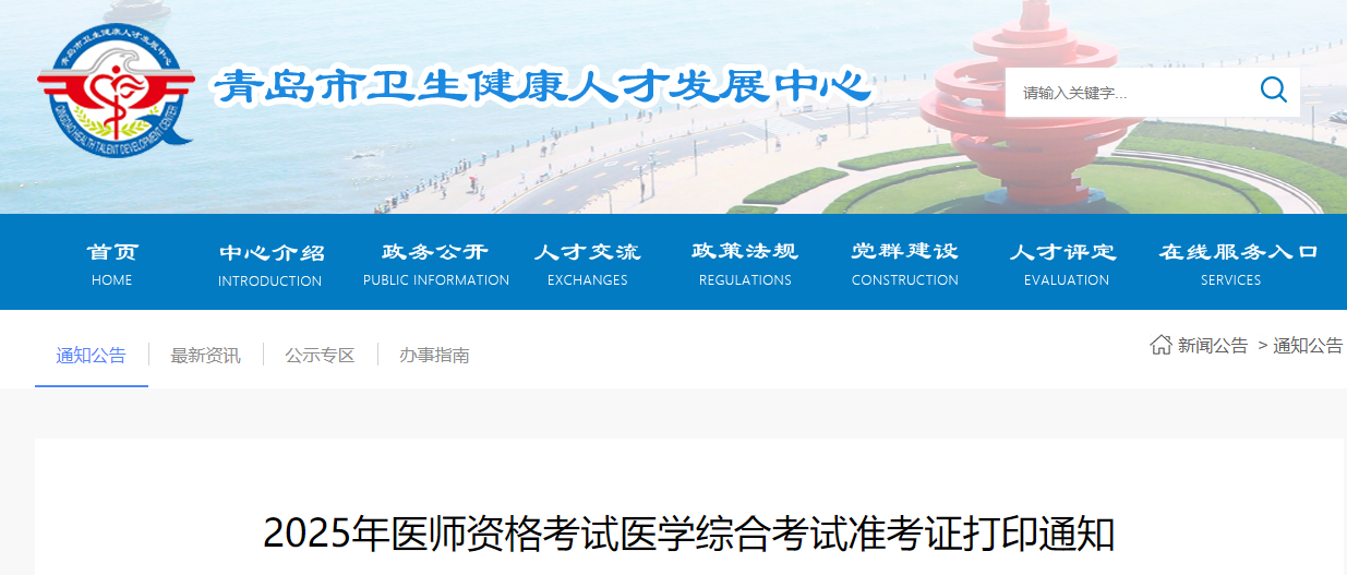 山东青岛2025年医师资格综合笔试准考证打印入口已开通,速去!以下为青岛考点官方通知,请相关考生按时打印准考证,提前确认好考场安排及考生须知!