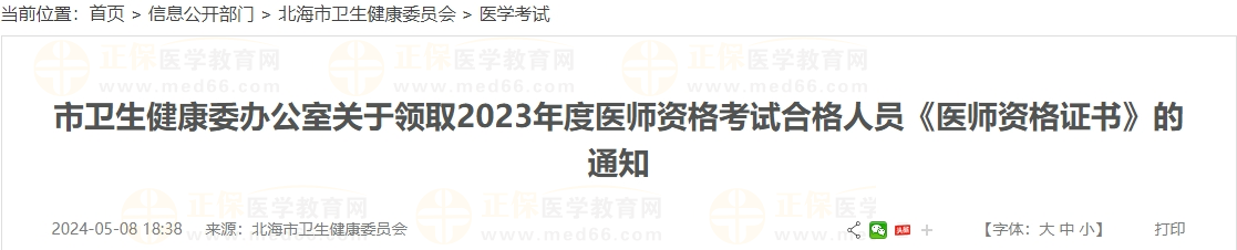 广西北海市关于领取2023年度医师资格考试合格人员《医师资格证书》的通知已发布,请各单位派员持单位委托书及委托人个人有效身份证件原件,于5月9日至5月24日期间到北海市医学考试中心统一领取。小编为大家整理通知如下: