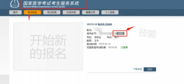 二、河北考区将于8月15日9:00开放考生准考证打印功能,请广大考生及时登陆国家医学考试网(www.nmec.org.cn),进入“国家医学考试考生服务系统”–“个人界面”,点击准考证号后的“打印”按钮,打印准考证(如下图)。