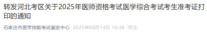 河北石家庄2025年医师资格综合笔试准考证8月15日起打印!请相关考生及时查看官方通知,做好应试准备!