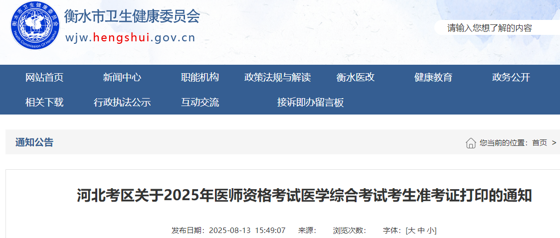 河北衡水2025年医师资格综合笔试准考证8月15日起打印!请相关考生及时查看官方通知,做好应试准备!
