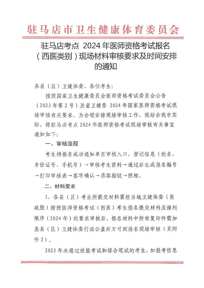 河南驻马店考点2024年医师资格考试报名(西医类别)现场材料审核要求及时间安排的通知!有关河南驻马店考点考点网上报名时间:2024 年1月22日至2024年2月4日24 时,小编整理如下,请相关考生及时查看,做好报名准备!
