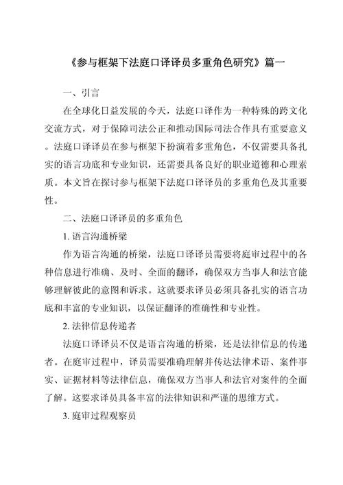 法庭口译在司法体系中扮演着关键角色,主要功能是确保法律程序中各种语言信息的准确传达。这项工作对于维护正义、保证诉讼各方在庭审中的公正参与至关重要。接下来,我将从不同角度对法庭口译的具体实践进行一番讨论。