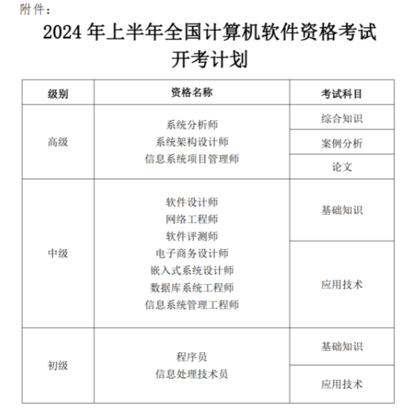 附件:2024年上半年全国计算机软件资格考试开考计划
