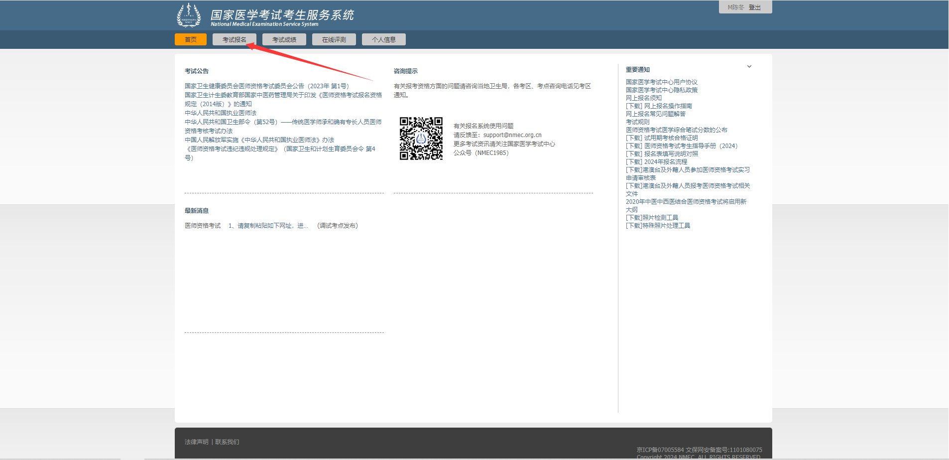 1、使用本人账号密码登录国家医学考试考生服务系统。