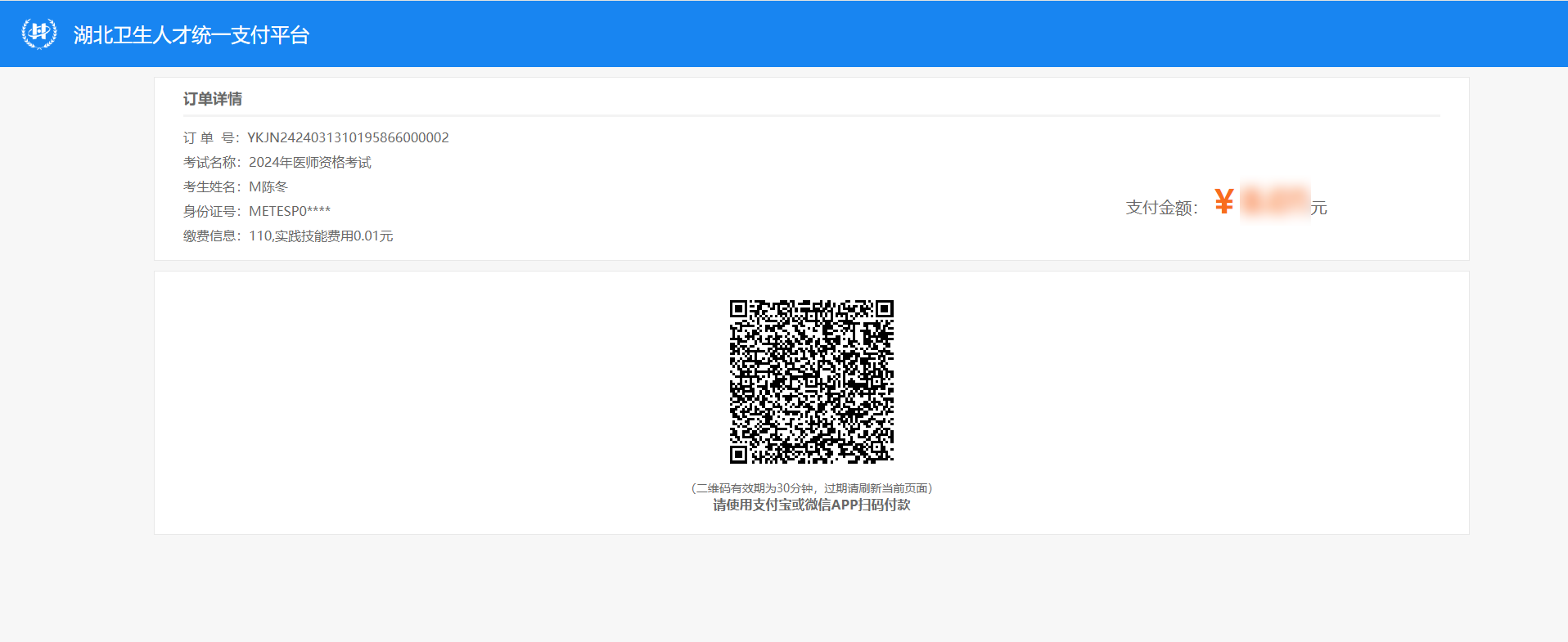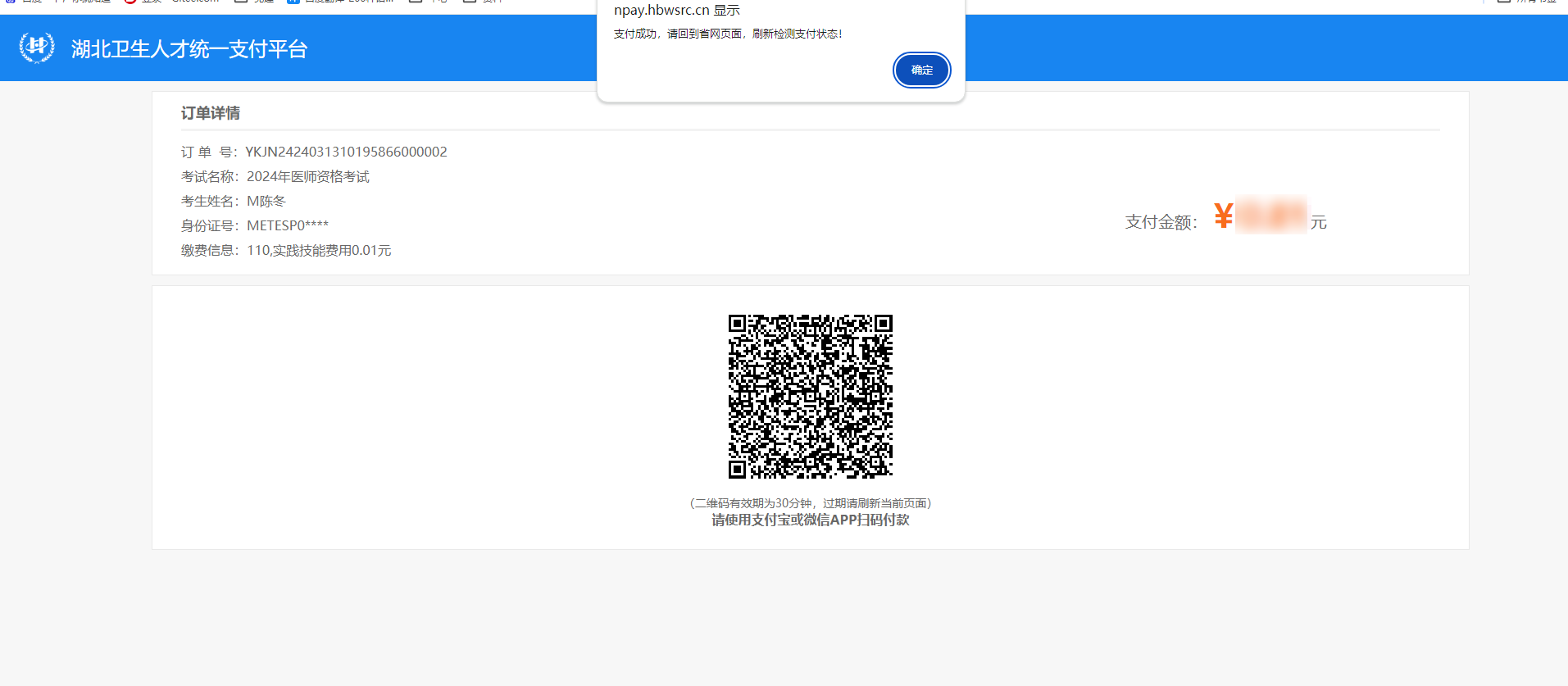 6、支付完成功后可直接关闭页面,返回国家医学考试考生服务系统。