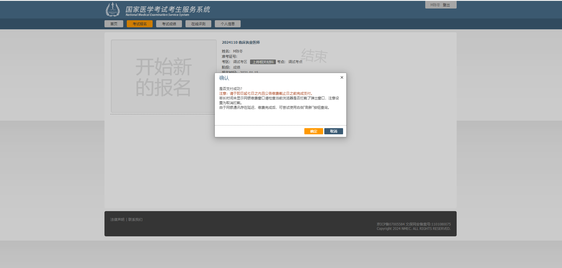 7、返回国家医学考试考生服务系统后根据弹框提示点击确定或取消。