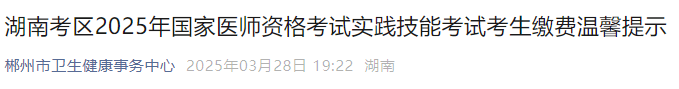 湖南郴州2025年医师资格实践技能缴费入口4月1日开通!缴费时间为4月1日14时至4月10日23时。以下为考点官方发布的缴费流程以及注意事项,请相关考生提前了解缴费要求,按时完成缴费!
