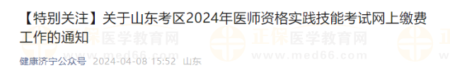 特别关注!关于山东考区济宁考点2024年医师资格实践技能考试网上缴费工作的通知已发布,请各位考生于4月12日-4月18日期间登录国家医学考试网,进行网上缴费。小编为大家整理官方通知如下: