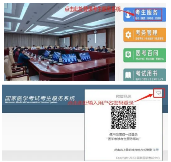 1.登录国家医学考试网(http://www.nmec.org.cn/),进入“考生服务”,输入用户名和密码或微信扫码进入个人系统。