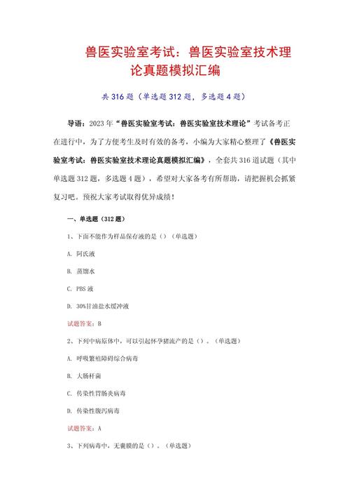 2009年的兽医资格考试真题对于我们了解那一年考试的走向、题型分布和知识点重点非常有帮助,对于备考兽医资格考试的考生来说,这些真题具有极大的参考价值。下面,我将从不同方面为大家详尽地介绍当年的真题情况。