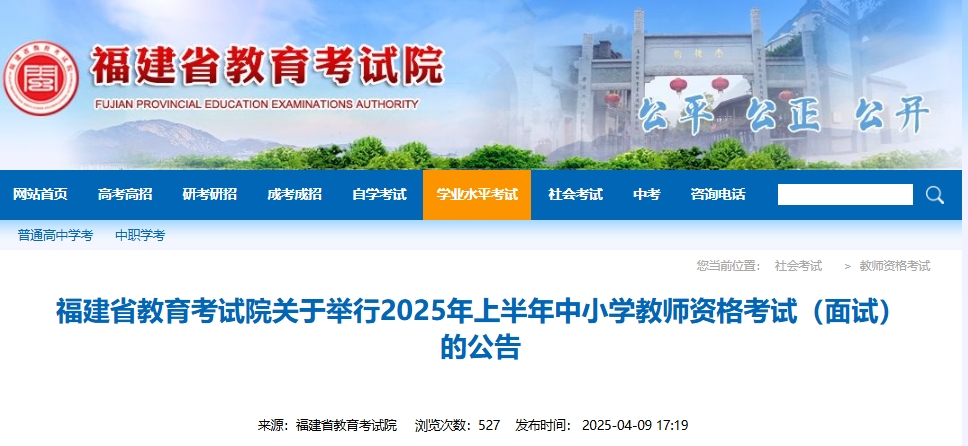 《福建省教育考试院关于举行2025年上半年中小学教师资格考试(面试)的公告》内容如下:
