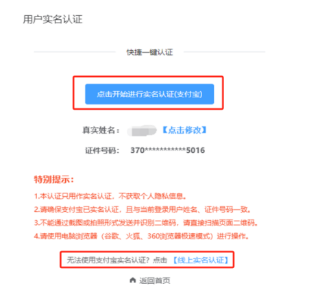 登录成功后,在报名前必须进行实名认证。可以直接点击“开始进行实名认证”按钮进行支付宝实名认证,使用本人账号支付宝扫码即可完成实名认证。
