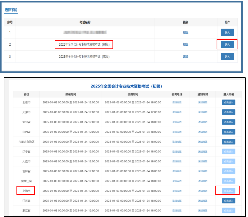 2. 选择“2025年全国会计专业技术资格考试(初级)”—“上海市”点击进入,完成阅读须知及报考人员必读事项等,选择报考条件,进入到报名信息填写页面。