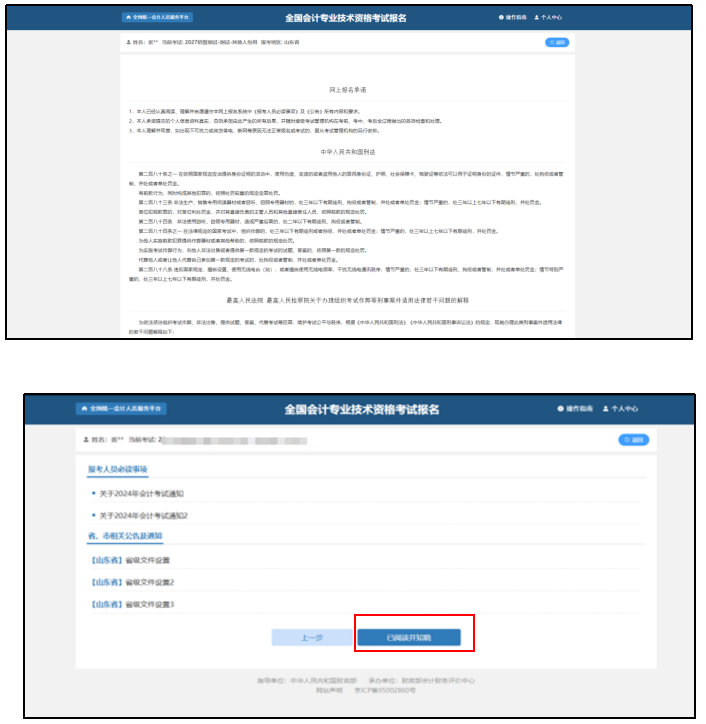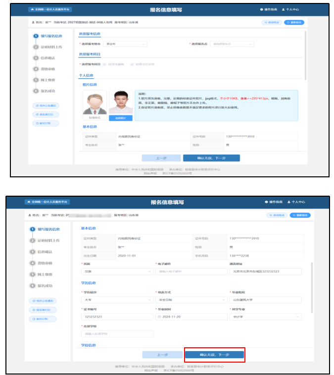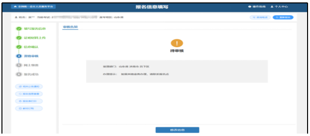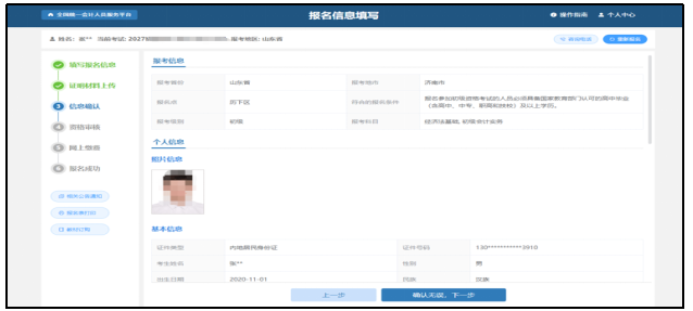 5. 确认信息无误后提交审核,等待审核结果。一般1个工作日后登录平台,可重新进入“会计专业技术资格考试”查看审核结果。