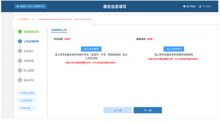 4. 报考信息填写完毕后点击“确认无误,下一步”,进入到证明材料上传页面,上传本人符合上海考区报考条件的属地证明和教育经历证明。