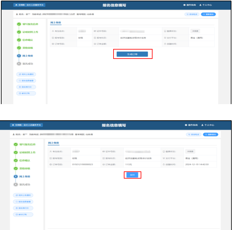审核通过进入到网上缴费的页面,点击生成订单支付,完成支付即为报名成功。
