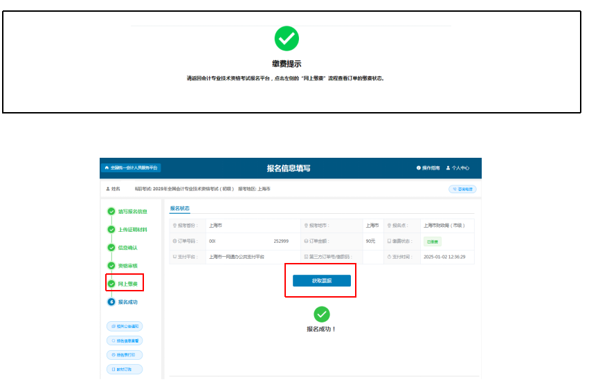 6. 缴费成功后,可直接按提示点击“网上缴费”查看订单的缴费状态,并点击“获取票据”开具并下载打印“上海市非税收入一般缴款书(电子)”,也可在缴费期间再次进入“会计专业技术资格考试”获取票据。
