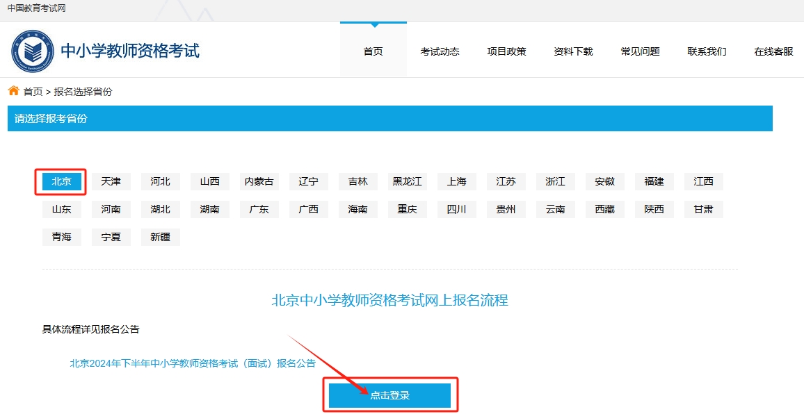 考生进入报名系统后,选择“北京”,点“点击登录”。