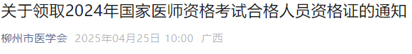 2024年参加国家医师资格考试成绩合格的考生,从2025年4月27日起可领取医师资格证书,现将相关事宜通知如下: