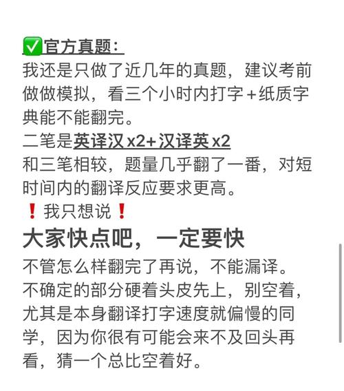英语基础十分关键,因此我在考前每天坚持学习新词汇,并且复习之前学过的内容。这样做可以增加我的词汇量,对阅读理解和翻译工作非常有帮助。此外,语法同样不容忽视,翻译时一旦出现语法错误,就会影响语句的准确性。我还会频繁练习分析复杂句子,以此来提升我的语法水平。